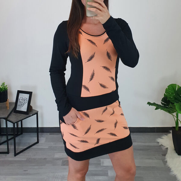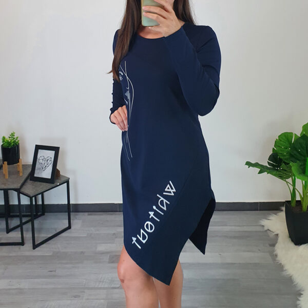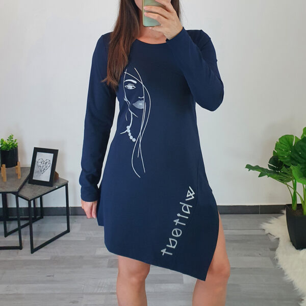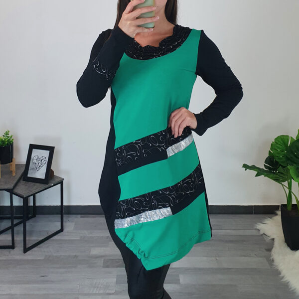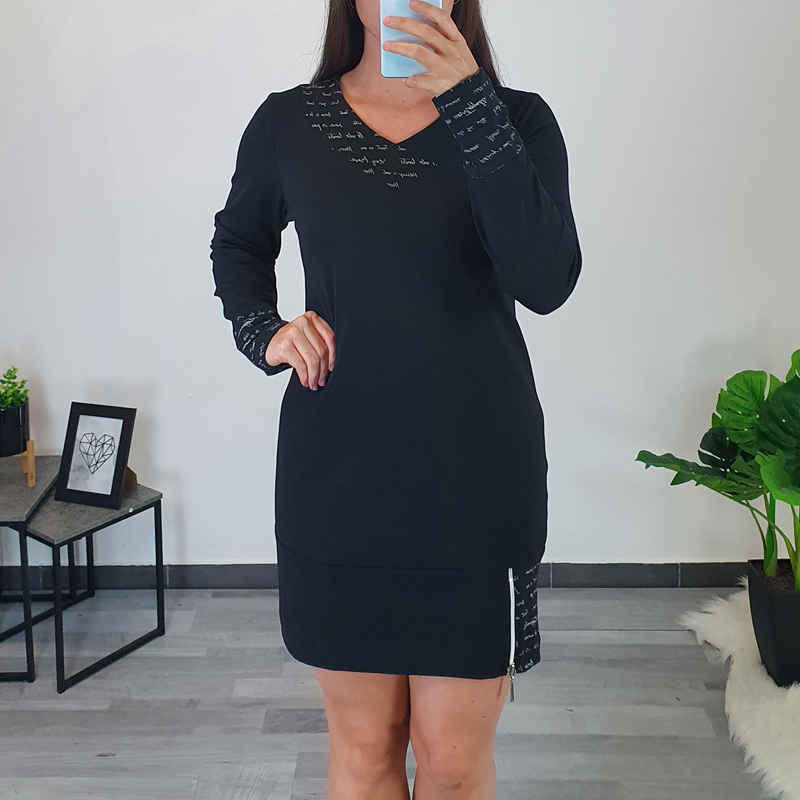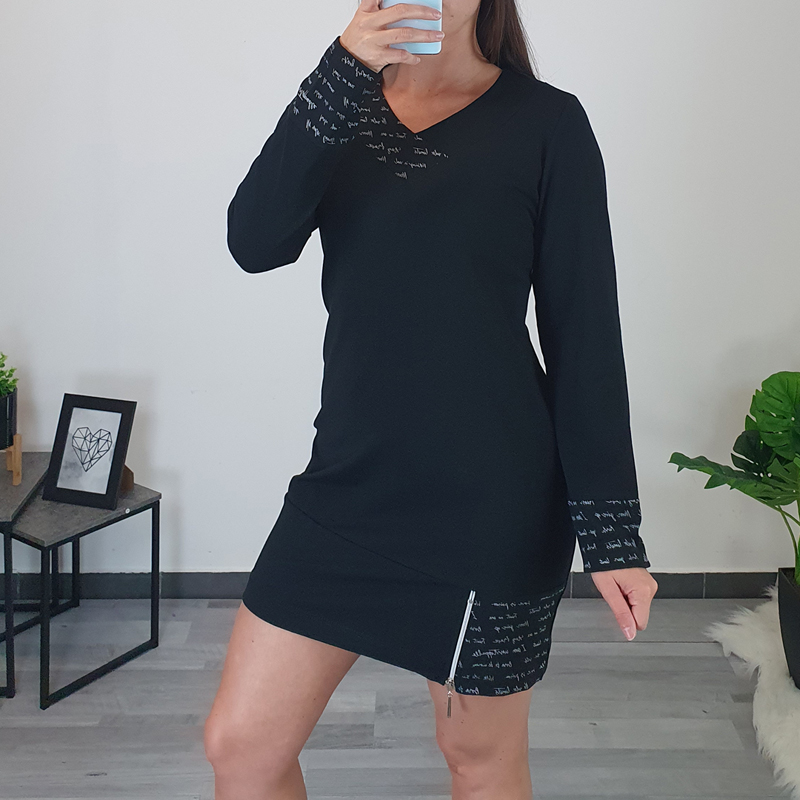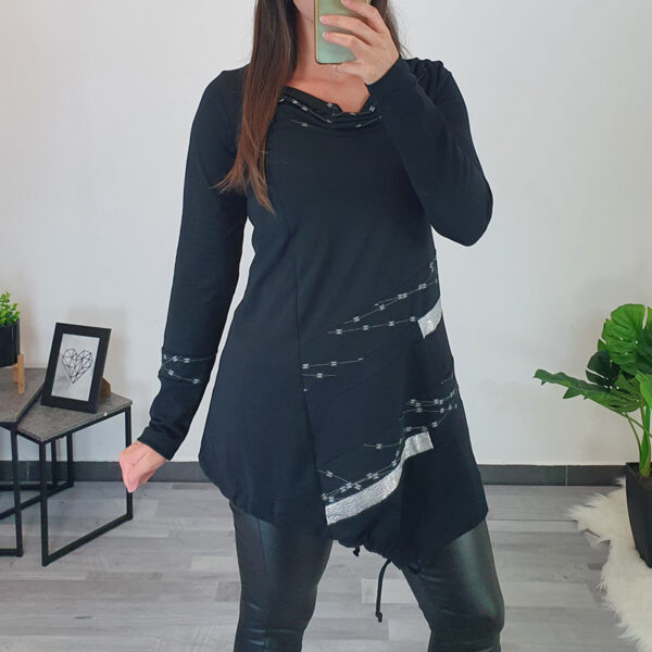 Modna tunika Martina u crnoj boji. Tunika ima duge rukave koji završavaju tkaninom s printom u srebrnoj boji. Kroj tunike je širi i normalne je dužine. Kombinirana je s printom, s desne strane ukrašena je srebrnim patentnim zatvaračem. Ovratnik je izrađen na “V”. Tunika je izrađena od visokokvalitetnog pamuka i ugodna je za nošenje. Dostupna od veličine 40 do veličine 54.